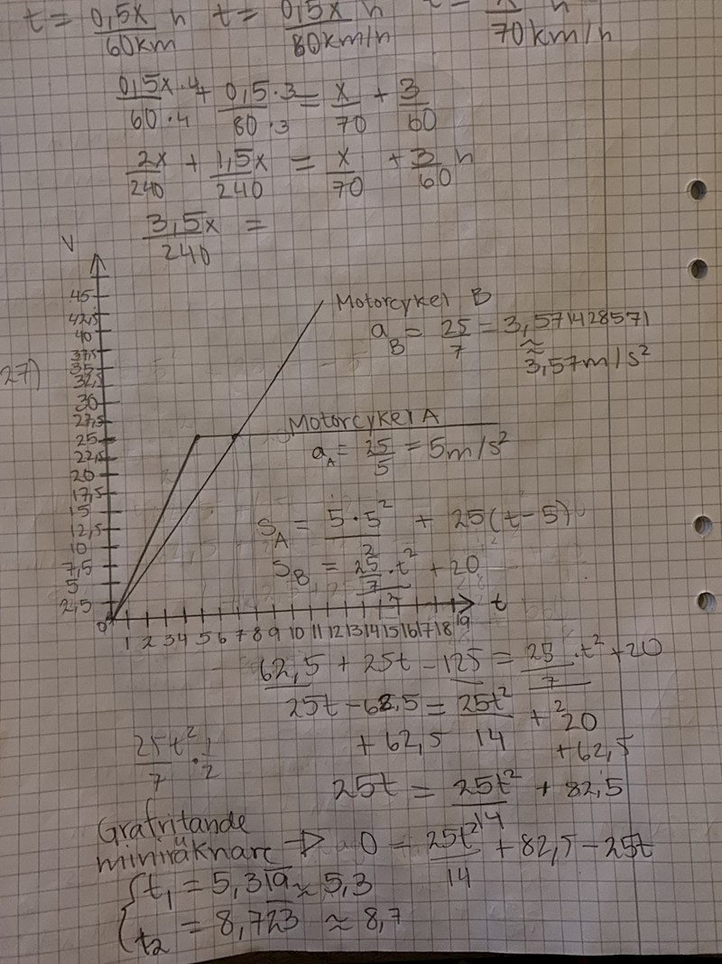 Det jag vill är att försöka ställa upp två ekvationer där tiden, t, är den ända okända. På så sätt kan jag lösa ut t. Problemet är att jag inte vet hur jag ska ställa upp en ekvation med t, dessutom har jag många frågor. Som typ kommer motorcykel B också ha konstant hastighet efter sin acceleration? Men aja så långt har jag kommit i alla fall.