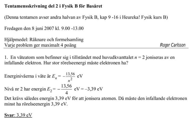 Jag tänker: E = -13,6 eV/ n^2 men vet inte om jag använt rätt formel