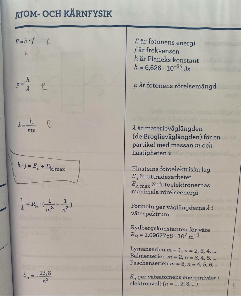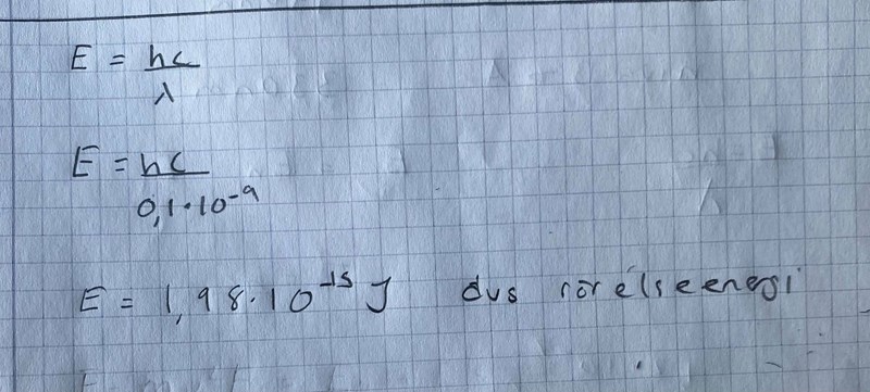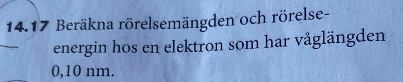 Vid denna uppgift tror jag man måste tänka lite kring infon man fått. Du har fått en våglängd endast. Du har ej fått någon metall eller utträdesarbete vilket gör det nära till omöjligt att använda formeln du inringat. Dock finns det en formel för rörelsemängd som du skrivit e framför och det är den du ska använda för att beräkna rörelsemängden. Sen rörelseenergin.
