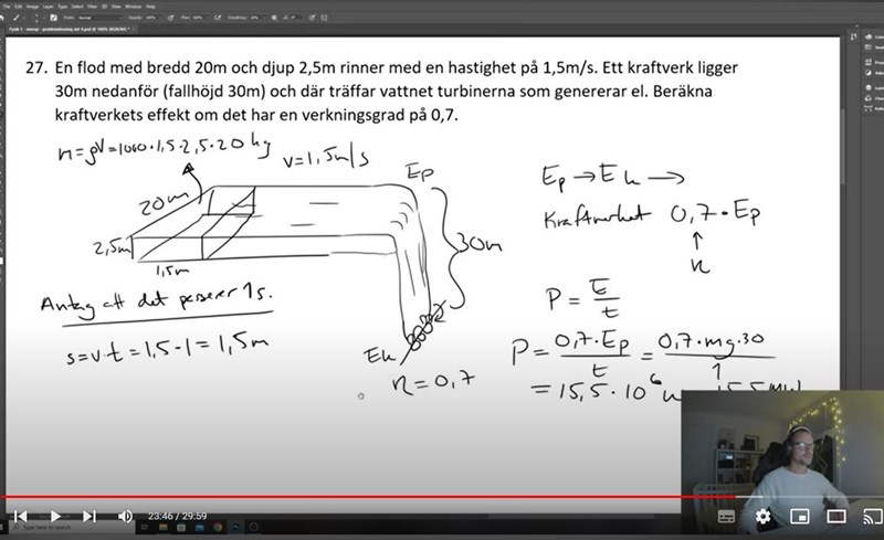 I den här uppgiften förstår jag inte varför all potentiell energi blir till rörelseenergi. Är inte den mekaniska energin ep + ek och därför eftersom vattnet har en rörelse innan den faller borde både ek och ep omvandlas till enbart rörelsenergi? Varför försummas detta i uträkningen?