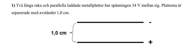 Ture skrev:Det står i uppgiften vad spänningen, dvs potentialskillnaden mellan plattorna är.