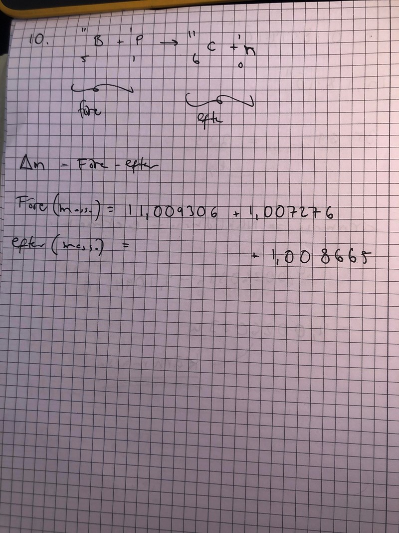 Om jag ska ta skillnad i massa m för att utnyttja formeln så måste jag åt nuklidmassorna före respektive efter.
