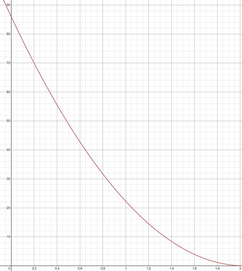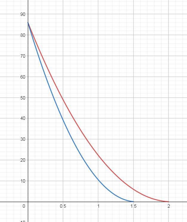 Detta gör att du kan kvalitativt rita en figur som ligger under den du först ritade. Du når helt enkelt noll kinetisk energi tidigare än 2 sekunder. Du börjar fortfarande vid 86 J men du når som sagt 0 J tidigare. Att implicera det i funktionen kan du göra genom att faktorisera andragradaren och göra ena roten till 1.75 eller något istället för 2.