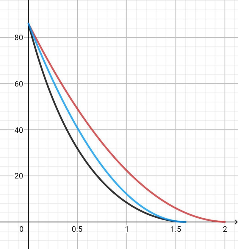 Där röd är den ursprungliga andragradaren du tog fram, blå är den där vi justerar roten till 1.6 för att kvalitativt emulera effekten luftmotstånd har på kinetisk energi och svart är så som det faktiskt blir enligt riktiga modeller av luftmotstånd för en fotboll som flyger genom luften.