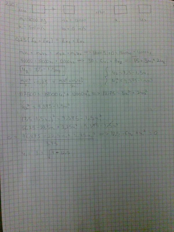 En järnvägsvagn, som har massan 18 ton och hastigheten 5,0 m/s, kolliderar med en stillastående vagn, vars massa är 12 ton. Med vilken hastighet rör sig vardera vagnen efter kollisionen, om 25% av den kinetiska energin går förlorad vid stöten.