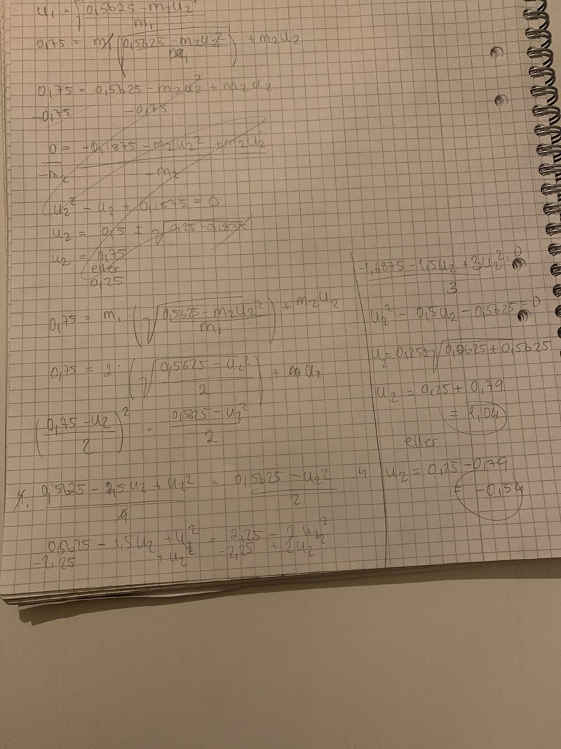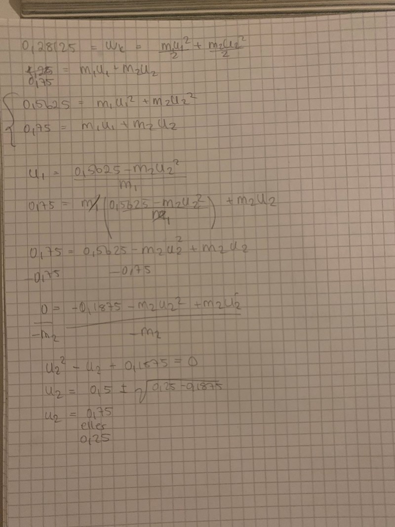 jag löste ut u1 från ekvation 1 och satt i ekvation 2 men får två svar för u2 vilka är 0,75 m/s och 0,25 m/s