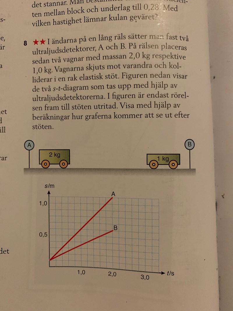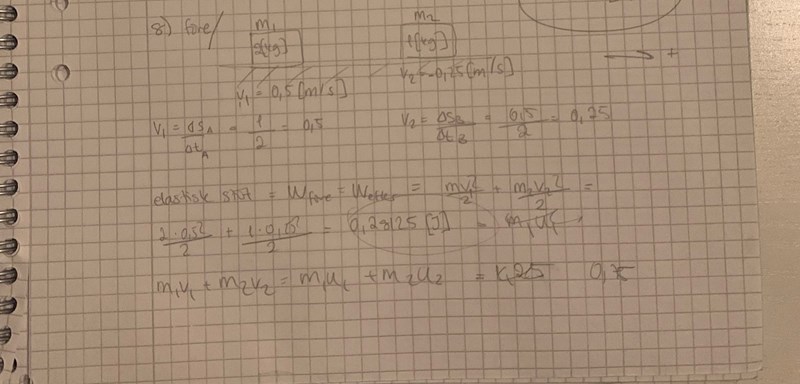 jag håller på med uppgiften ovan. Jag hittade att hastigheterna före kollisionen är v1= 0,5 m/s och v2= -0,25 m/s då den går i motsatt riktning. Elastisk stöt ger att Wk efter= Wk före = mv2/2 = 0,28125