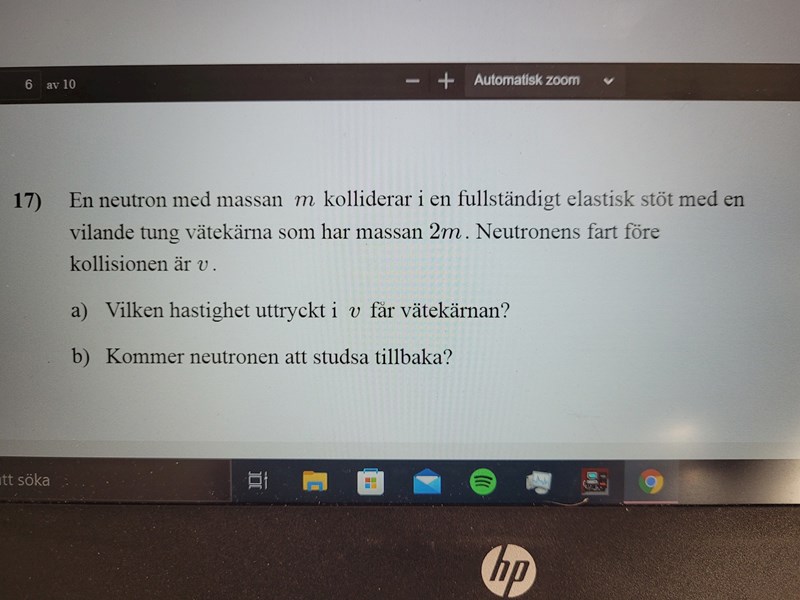 Jag har försökt ställa upp det som en ekvation där rörelsemängden före är samma som efter. Alltså m*v+2*m*0=m×v¹ + 2m*v²