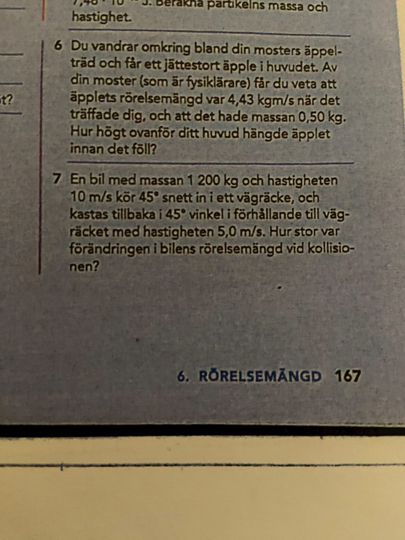 jag vet inte riktigt vad man ska göra med faktumet att det är 45°. Svaret i facit är 1.3 * 10^4 kgm/s