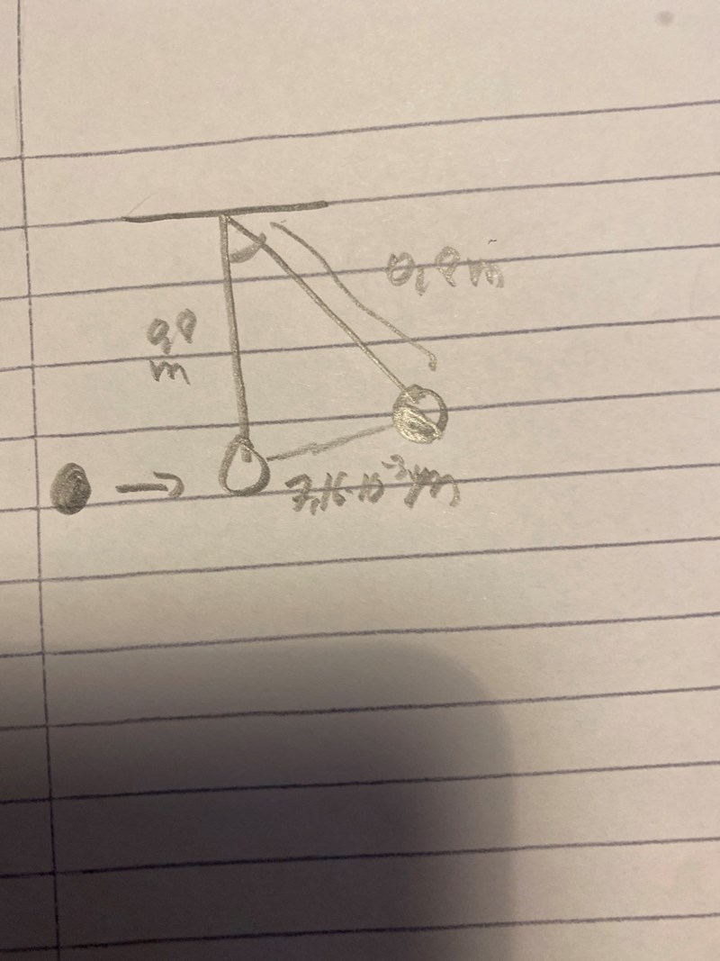 En kula med massan 1,50 kg hänger i ett snöre. Avståndet från kulans centrum till upphängningspunkten är 0,80 m. Kulan träffas av en lerklump som omedelbart före kollisionen har den horisontella hastigheten 6,0 m/s, se figur. Lerklumpen, som har massan 0,10 kg, fastnar på kulan.