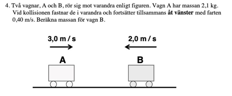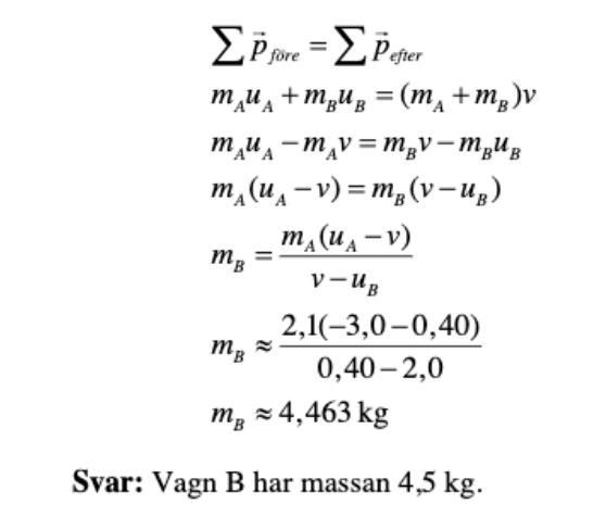 Jämför med facits beräkning, så ser du att skillnaden är att de satt ursprungshastigheten på A till -3, inte 3. Det har med riktning att göra. De har valt att "vänster" är positiv riktning, så sluthastigheten 0.4 som går åt vänster är positiv, och ursprungshastigheten på B är 2.1. Eftersom A går i motsatt riktning, får hastigheten omvänt tecken: -3.