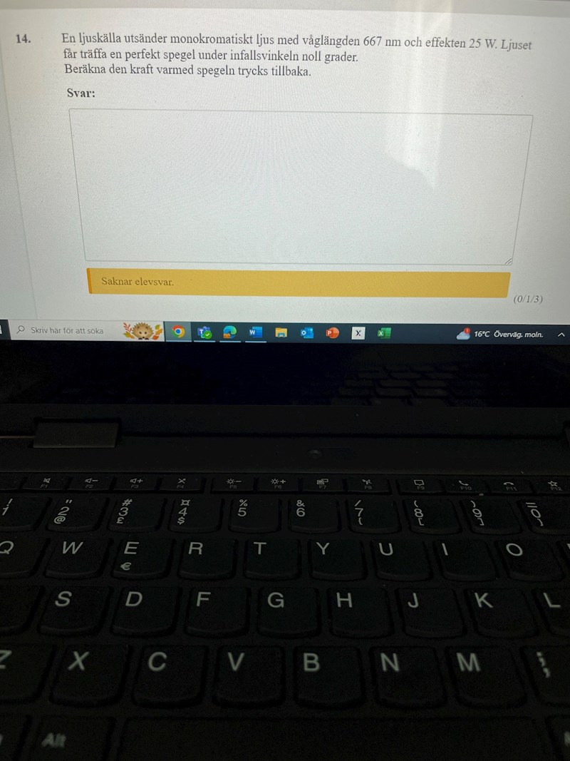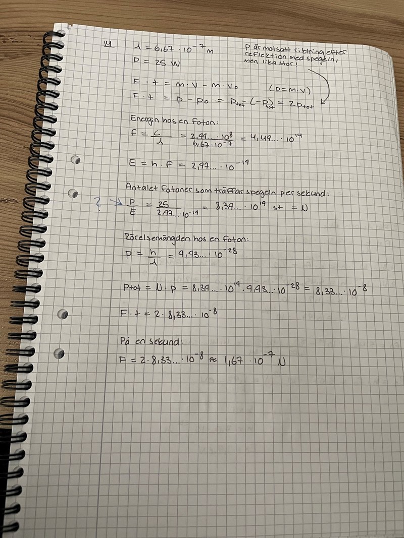 Hej! Har hållit på med frågan som nu ser på bilden och på andra bilden ser ni min lösning. Förstår dock inte riktigt hur man kan få ut antalet fotoner som träffar spegeln per sekund genom att dividera effekten med energin hos en foton (se blåmarkerad i lösningen). Tacksam för en förklaring!