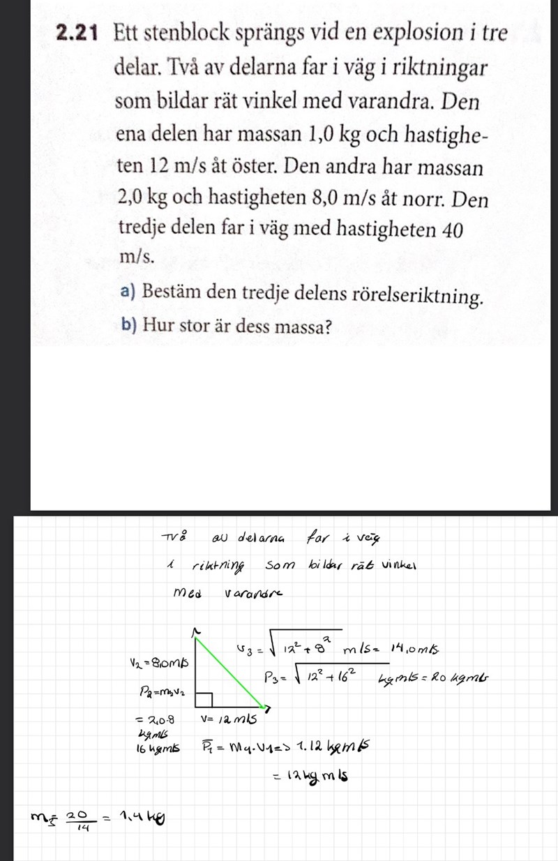 Var får du v3 från? Det är givet att den tredje biten får en hastighet på 40 m/s. Tänk dig ett referenssystem där stenen ligger och då har rörelsemängden 0. Efter smällen så ska summan av rörelsmängd fortfarande va 0 så den tredje biten ska ta ut summan av de två första bitarna. Du har räknat ut deras sammanlagda rörelsemängd korrekt men figuren är lite missvisande. Den rörelsmängden ska nu kompenseras av den tredje bitens som då får en riktning som är vektorsumman av de två andra och vars vikt ger samma rörelsmängd givet dess hastighet.
