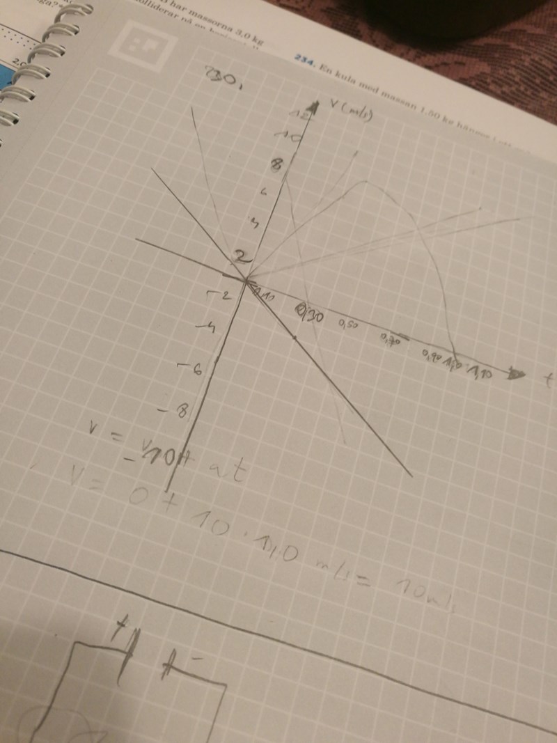 Och jag föreslår att vi väntar lite med v/t-diagrammet tills vi vet att du har koll på hur kulan rör sig och vad som händer med dess hastighet under tiden. Dessutom tror jag att det är viktigt att du håller isär kulans position, dvs dess höjd och dess rörelse, dvs dess hastighet.