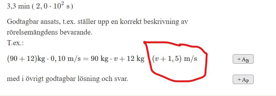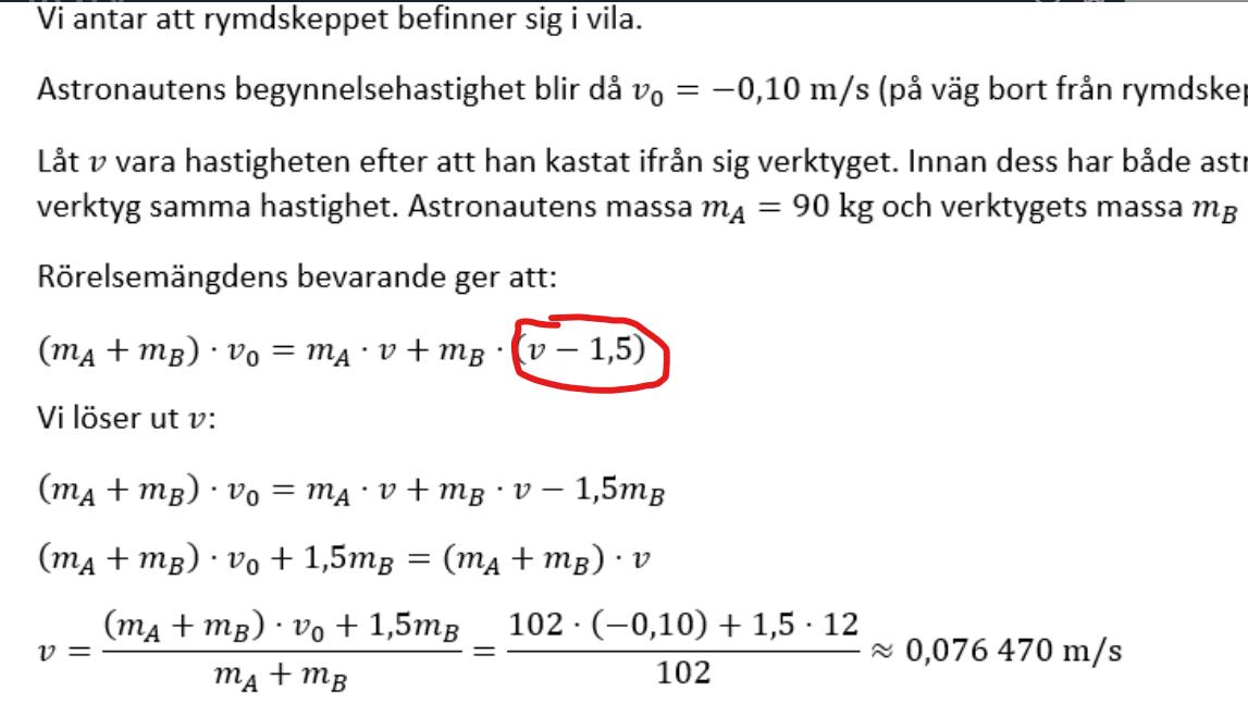 Notera bild två istället. Om jag tolkar det rätt betyder v+1,5 verktygets hastighet, alltså det som uppgiften skriver som "1,5 m/S relativt astronauten". Verktyget färdas 1,5 m/s snabbare än astronauten gör EFTER han kastar den. Just det där med EFTER tycker jag för det första är lite svårtolkat från uppgiften. Jag tolkade det från början som att verktyget rör sig 1,6 m/s, alltså 1,5 m/s snabbare än astronautens 0,1 m/s. Håller ni med?
