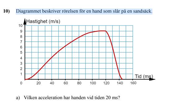 Såg inte att det stod i millisekunder, men fick nu 7,5. Bör jag räkna ut uppgiften med area? För om jag räknar det i area får jag ut en sträcka och inte en acceleration. Jag har lärt mig att acceleration är lutningen.