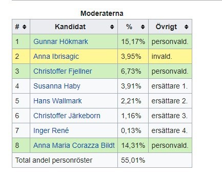 Jonto skrev:I riksdagsvalet så ska det väljas 349 ledamöter till riksdagen. De här 349 mandaten är fördelade i 29 olika valkretsar. Exempelvis så har Hallands län 10 mandat. Hur mandaten delas ut är lite komplicerat men säg exempelvis att Moderaterna får tre av dessa mandat i Halland. Om Moderaterna i Halland får 3 mandat så är det de tre som stått överst på Hallandsvalsedeln för Moderaterna. Det går dock att personrösta för kandidaterna. Om någon av de som står utanför de tre första platserna har fått många personröster har fått minst 5 % av rösterna och fler än någon av de som står på plats 1-3 så kommer de att putta ner de andra kandidaterna och få en plats. Det är ganska svårt att bli personvald, då ganska få väljare personröstar och det brukar bara vara några få stycken varje år som klarar sig genom personval. De som redan står högst upp och ändå blivit valda brukar få flest röster.