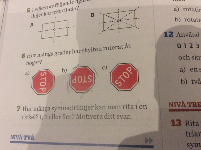 Får du använda en gradskiva? I sådant fall, dra ett streck genom texten STOP som den brukar stå, dvs vågrätt, och ett streck genom den nya, vridna stop. Hur står är vinkeln mellan linjerna?