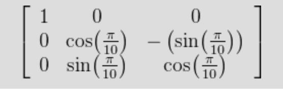 Eftersom vi roterar kring x-axeln, blir x-axeln orörd och första kolonn blir nog (1,0,0). Rotationen blir isf (tänkte jag):