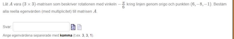 Hej jag lyckades räkna ut A med hjälp av datorn för att det var så pass svåra tal och egenvärderna till a dvs svaret dom ville ha på frågan är 1. så det känns värkligen som att det ska finnas ett annat tillvägagångsätt.