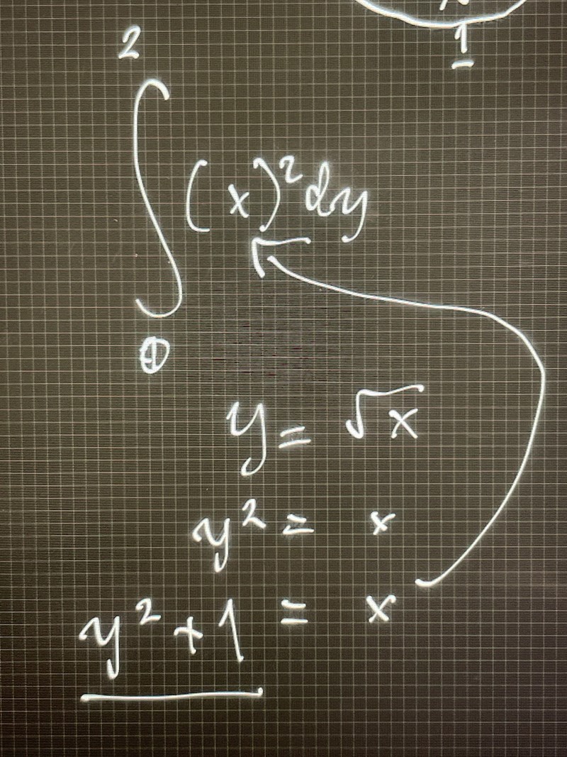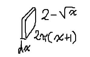 Man tänker att skivan är så tunn att man kan räkna på en "cirkels omkrets" (därifrån kommer 2π(x+1)2\pi(x+1)). Volymen på ett sådant rätblock är trivialt 2πdx(x+1)(2-x)2\pi\mathrm{d}x(x+1)(2-\sqrt x). Så om vi summerar oändligt många sådana volymer kommer vi fram till en integral som ger volymen på rotationskroppen.