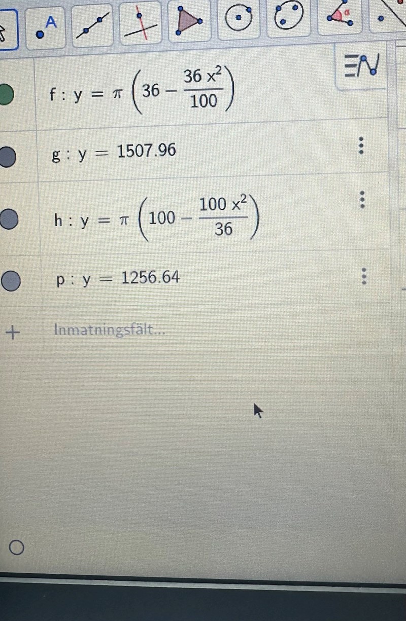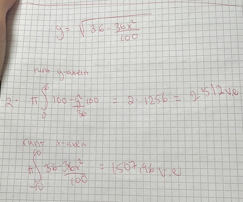 Hej jag undrar jag vill bilda en oval ”boll” med den här funktionen för att beräkna volymen tänker jag att det finns två alternativ antingen roteras den kring y Axel och så multipliceras den volymen med 2 eller så roterar den Krim x axeln . Jag får dock inte samma volymer ??? Vad för fel gör jag eller ger de inte samma volym
