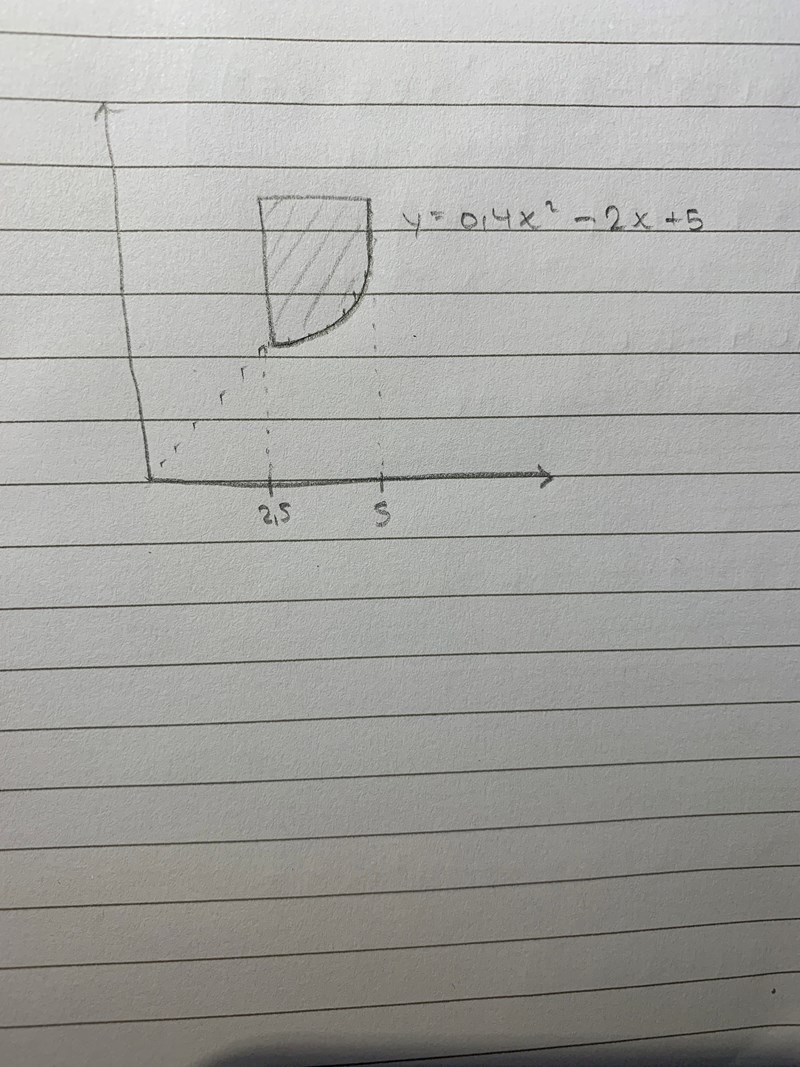 Men det är inte volymen som roterar runt y-axeln utan volymen "skapas" av att området som begränsas av y = 0,4x^2-2x+5, y = 5 och x = 2,5 roterar runt y-axeln.