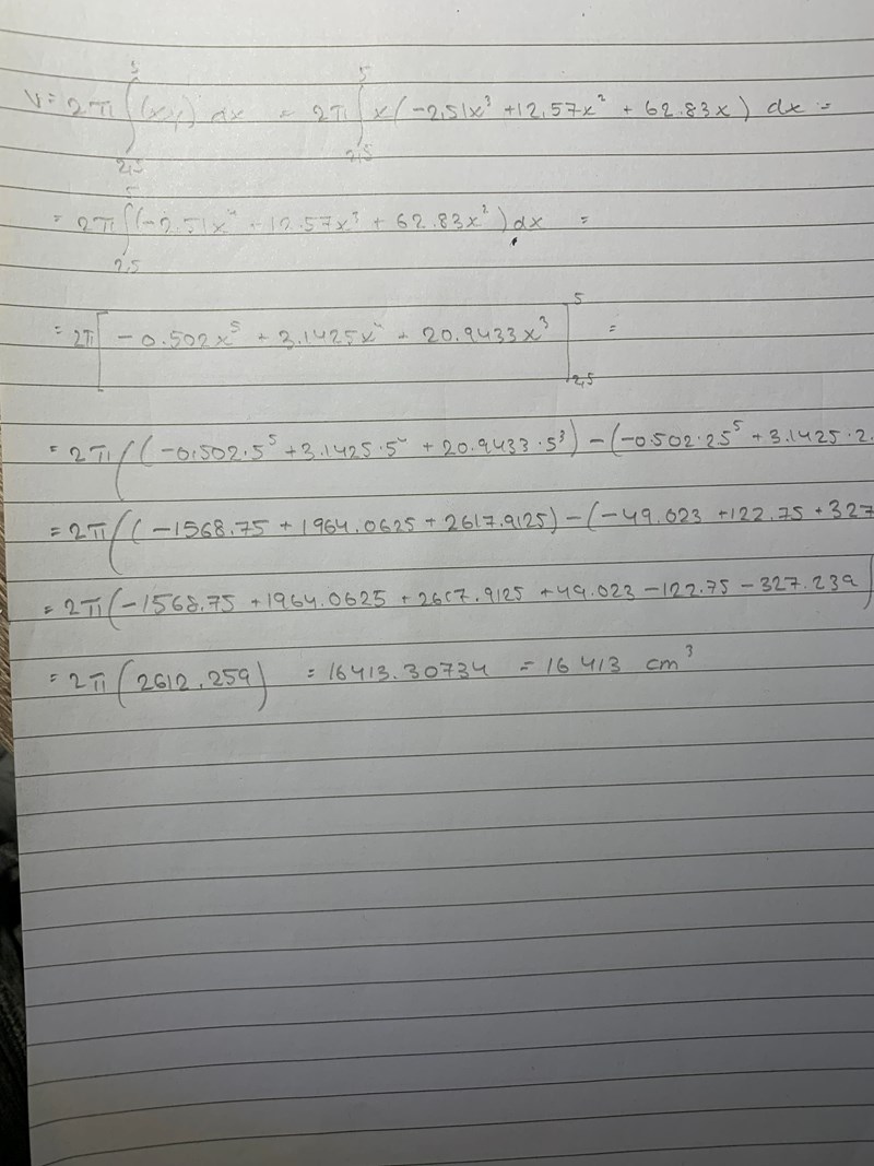 Volymen av den tredje delen kan du få fram genom att integrera de cirkulera skalen från radie x = 2,5 till radie x = 5.