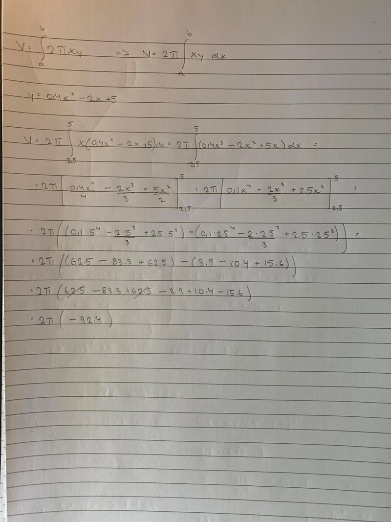 Har använt mig av rotation med cylindriska skal nu då man inte behöver krångla till det med de två X:n på det högra ledet. Nu har jag dock fått ut ett negativt svar. Integrerade med gränserna 2.5 till 5 då det är där som glaset har en böjning i form av en andragradsfunktion.