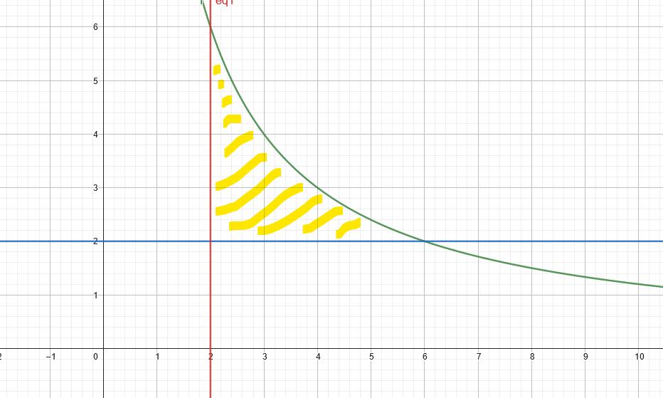 den röda linjen visar startintervallet och den blåalinjen visar var y begränsas. Föreställ dig nu att du tar bort allt som ligger över y=2 som befinner sig inom kurvan och intervallet .