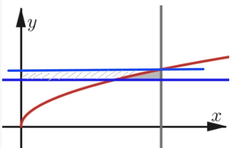 Det ser ut som om du försöker beräkna volymen som bildas då det gråstreckade området som jag markerat i bilden roterar ett varv runt y-axeln.