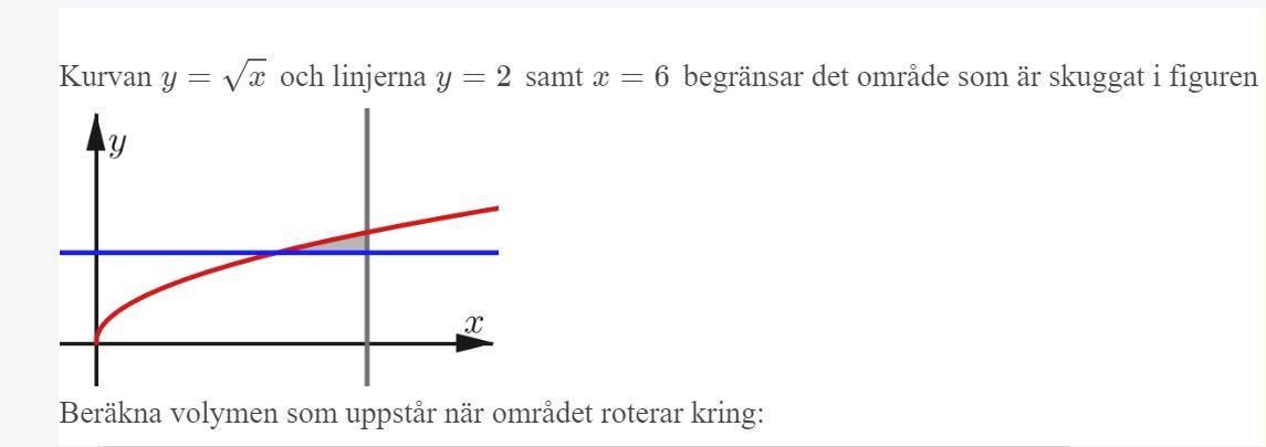 eftersom det roterar runt y-axeln skrev jag om det till x = y^2 och ena ändpunkten är y = 2 och den andra är kvadratroten ur 6