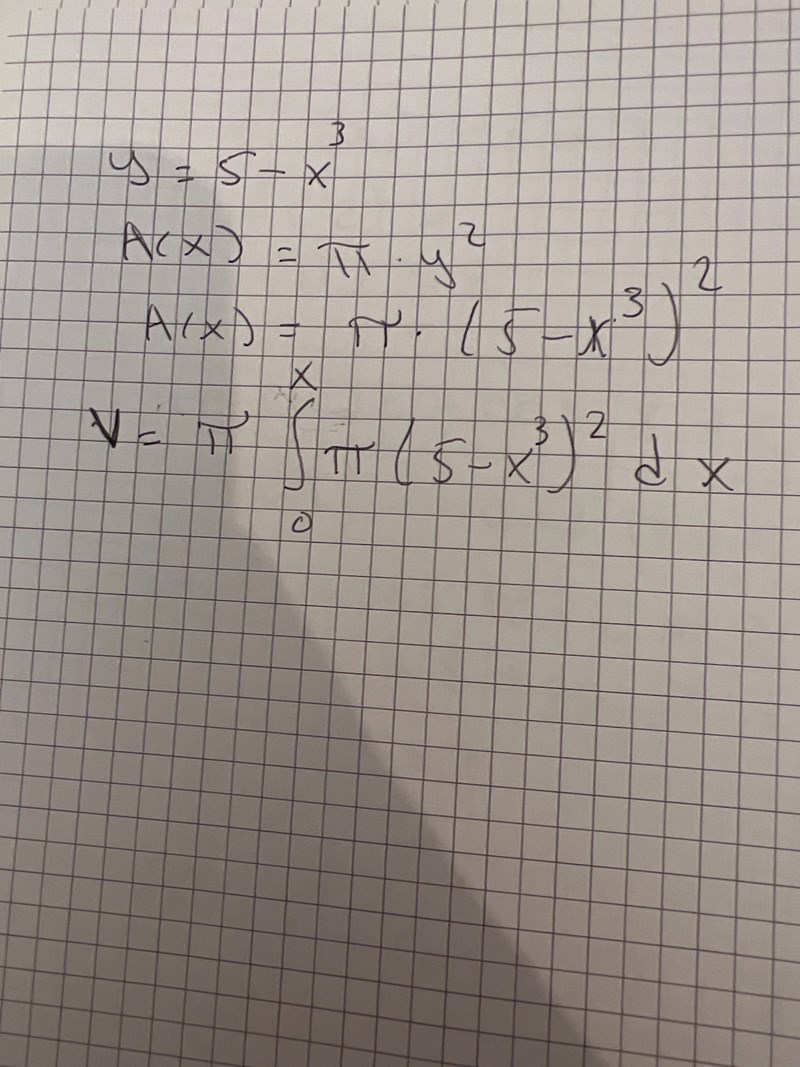 "Området som begränsas av kurvan y=5-x^3 och de positiva koordinataxlarna roterar kring x axeln. Bestäm volymen av den rotationskropp som bildas. Svara med två decimaler.”