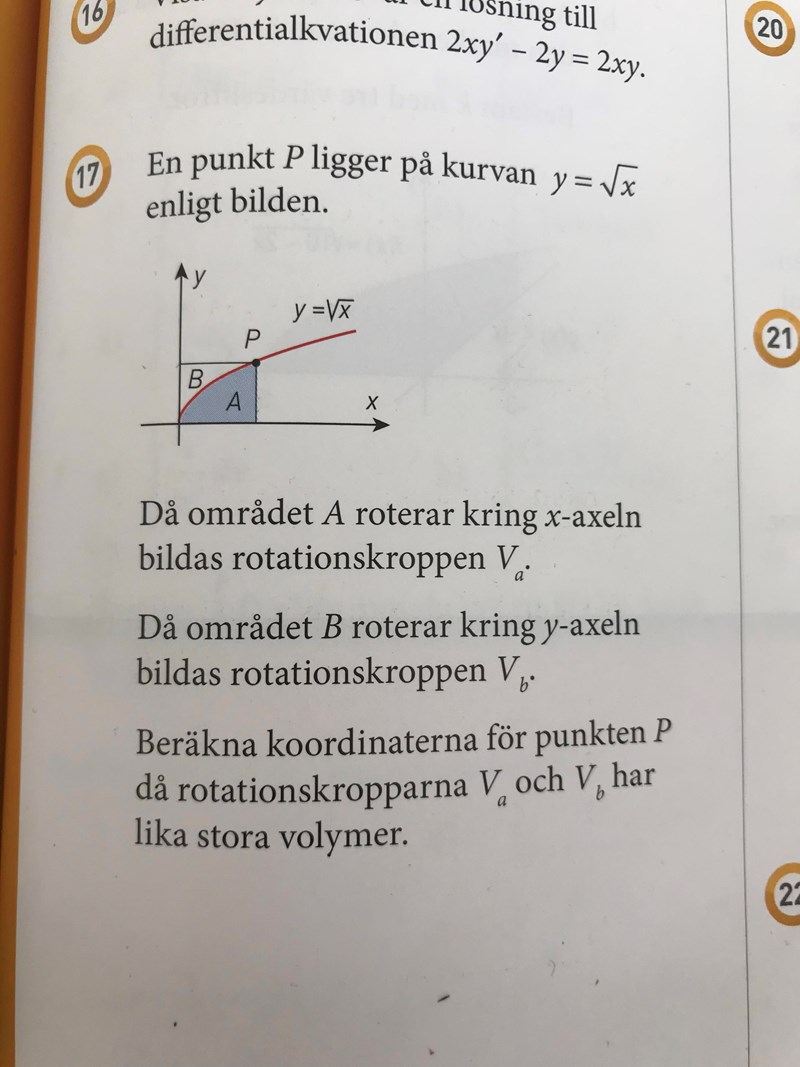 Jag tänkte förklara hur jag har tänkt hittills, men förmodligen är det helt galet eftersom jag inte ens är nära att få fram ett svar. Jag kallar koordinaterna i punkten P för (a,b). För att räkna ut volymen av rotationskroppen A så tar jag pi * integralen av y upphöjt till 2, alltså x (x^0,5)^2 = x^1=x mellan 0 och a (eftersom a är x-koordinaten i P). Volymen Va blir då (pi*a^2)/2.