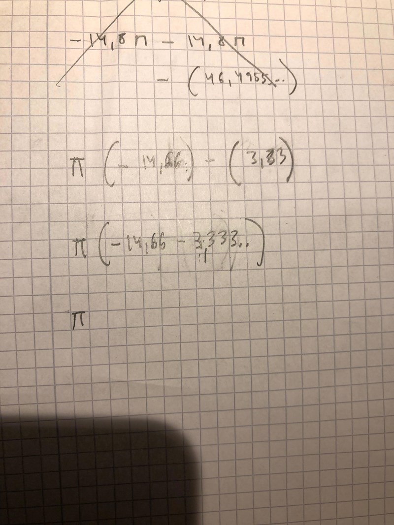 Jag får då antingen -2,0943951 (om jag gångar pi med paranteserna var för sig eller om jag lägger ihopa paranteserna och sedan gånger det med pi får jag -56,5486..