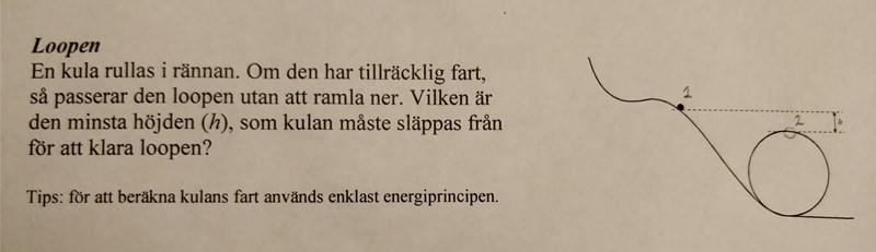 Detta är vad jag kom fram till: vid läge 1 finns det både rörelseenergi och lägesenergi medans i läge 2 finns det endast rörelseenergi då man har satt 0-punkten på loopens topp. Genom att skriva att energierna i läge 1=2 och dividera med massan så får jag: V0^2/r + gh=V^2. Där V0=starthastigheten, r=radien på loopen och V=faten vid läge 2. Stämmer sambandet?