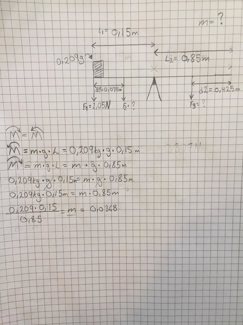 Vi ska räkna ut massan på en linjal genom att använda momentlagen M=M. Jag har räknat ut så här men det är fel. det ska vara ungefär 0.800g. Vart gick det fel i min beräkning? vikten på vänsterled är 0.209 kg