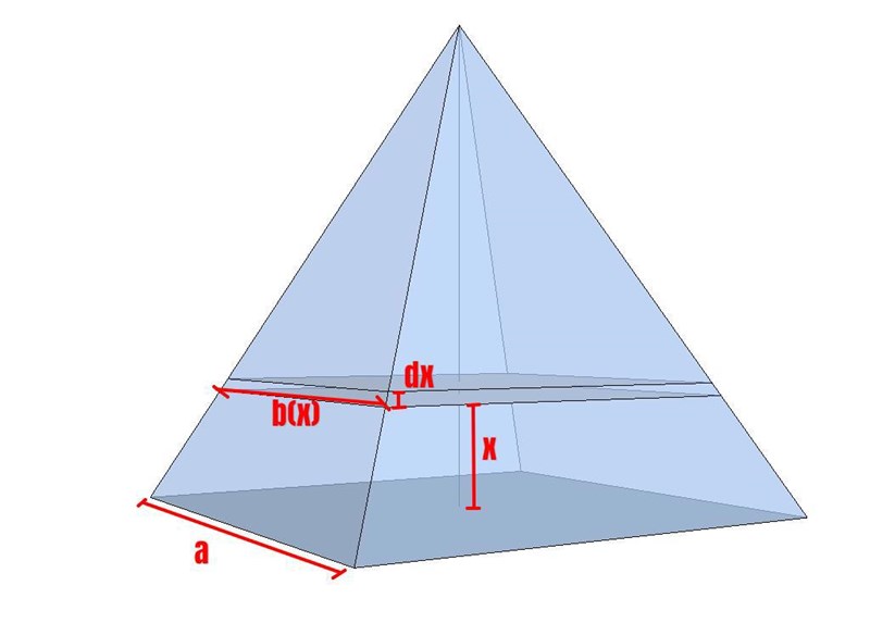 Här betecknar jag tvärsnittets bredd och jag låter dess höjd vara ett mycket litet tal . Om är ett mycket litet tal kommer tvärsnittet i princip att vara ett rätblock, och därför kan dess volym beräknas med . Om vi sedan låter variera mellan och och summerar alla dessa små volymer kommer vi att gå mot en integral som representerar pyramidens volym: