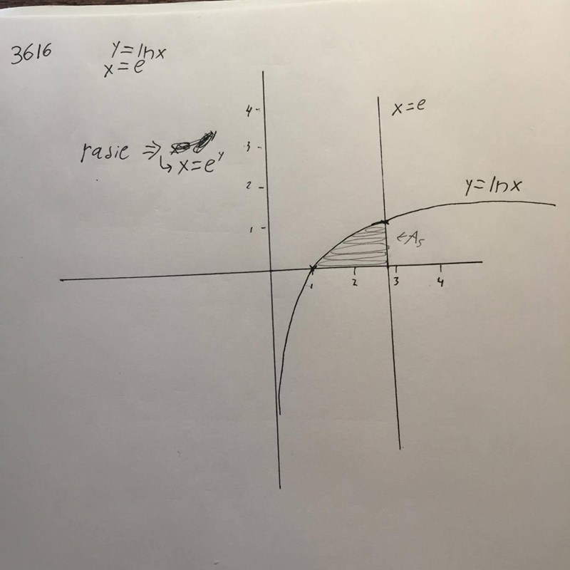 "Låt det område som begränsas av kurvan y = lnx, linjen x = e samt x-axeln rotera kring y-axeln.