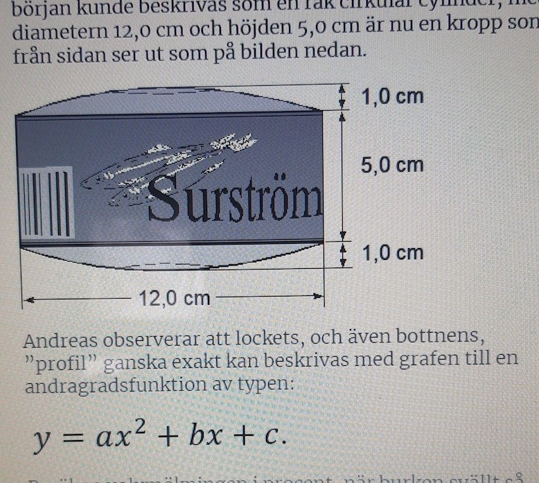 Jag vet hur jag beräknar volymen på cylindern men inte på den övre och undre delen eftersom jag inte vet hur jag får fram andragradsekvationen. Hur gör jag?