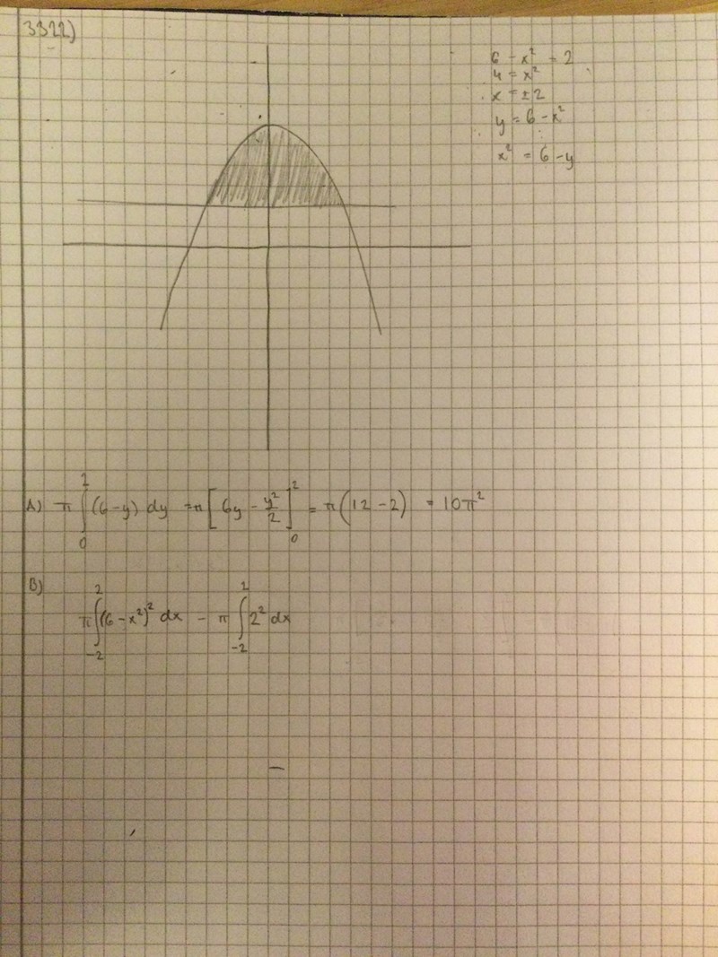 Men varför är andra integranden fel? Jag vet att man kan skriva det som integralen av pi * (4-x^2)^2 dx. Men varför fungerar inte mitt sätt?