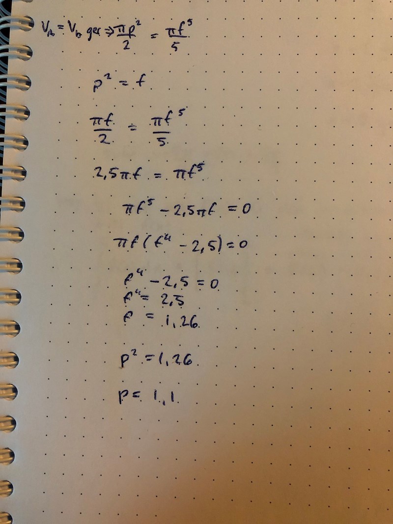 Jag vet inte hur jag kommer fram till svaret. Jag skrev uttryck för rotationsvolym A och rotationsvolym B. Därefter satte jag de lika med varandra. Kordinaterna till punkten P valde jag till (p,f). Det var dåliga variabler, kanske skulle det vara bättre att ta x och y.
