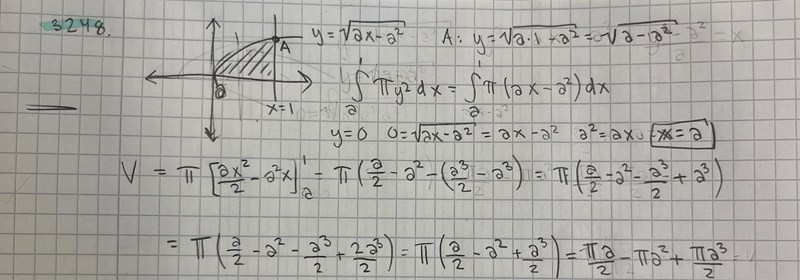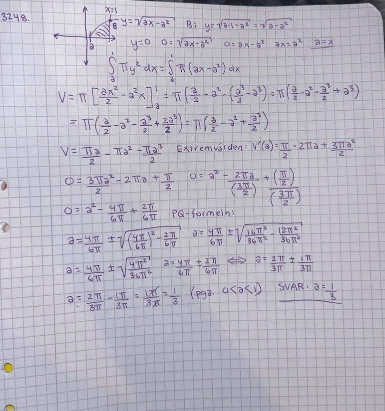 jag började att angripa uppgiften genom att skissa upp hur området bör se ut (till vänster på bilden nedan). För att få fram en integral behöver vi också veta dess gränser. X=1 antar jag blir övre då a Max kan nå ett värde mellan 0-1. Sen undre blir väll då grafen skär y-axeln. Dvs, 0=roten ur(ax-a2). Då bör väll linjen skära y där x=a. Då den roterar runt x blir väll integralen som nedan. Sedan gjorde jag den till en primitiv funktion och provade försökte jag sätta in mina gränsvärden, så i uträckningen nedan. Jag förstår inte hur jag ska ta mig vidare nu? Har jag tänkt rätt? ☺️