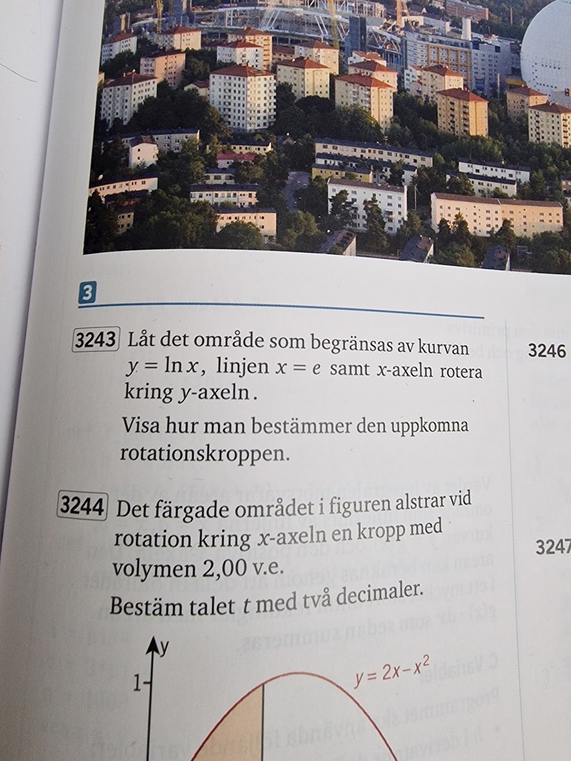 Uppgift 3243. Jag ritade en skiss av området, och förstår att det blir ett "hål" som inte ingår i volymen. Det jag inte förstår är varför volymen av området beskrivs med integralen av e^2y.