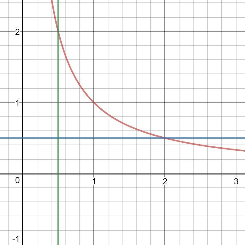 Det du ska göra är att beräkna volymen som bildas om du går från y = 0 till y = 1/x och sedan dra bort volymen som y = 0.5 tar bort från figuren.