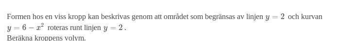 Förstår däremot inte vilken "del" som integralen ska göras på. Menar de den övre eller undre delen? Tänker då y=2 "delar" 6-x^2 i två delar. Antar att de menar toppen, för annars borde de väl skrivit att kroppen även begränsas av x-axeln?