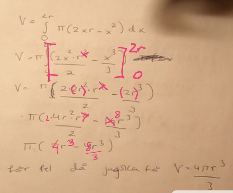 Det vet jag inte. Jag får integralens värde till 16πr33\frac{16\pi r^3}{3}, så antagligen har du ställt upp integralen fel.