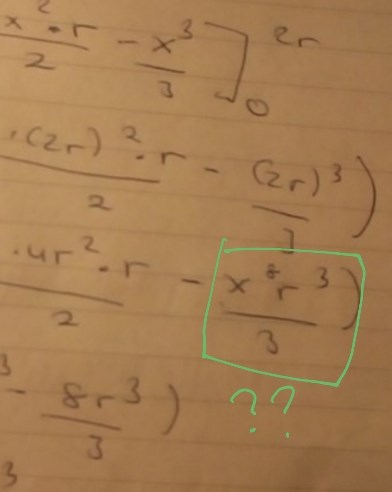 Nu ser jag en sak till, före alla andra steg här: när du sätter in 2r i integranden så får du x^2 att bli 2r^2. Det skulle bli (2r)^2, dvs 4r^2, och här skulle man märka att något var fel i metoden, för nu blir alltihop noll. (Det är för att du har kastat bort allt som ligger mellan integrationsgränserna, och i gränserna är integranden noll i det här fallet.)