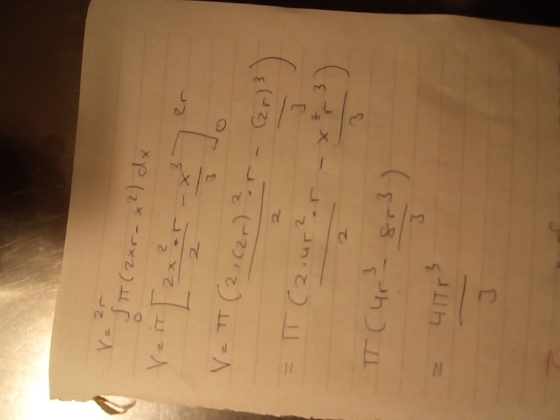 V = pi(2*2r*r - 2r^2) = pi(4r - 2r^2) = pi(4r^2/2 - 2r^3/3)