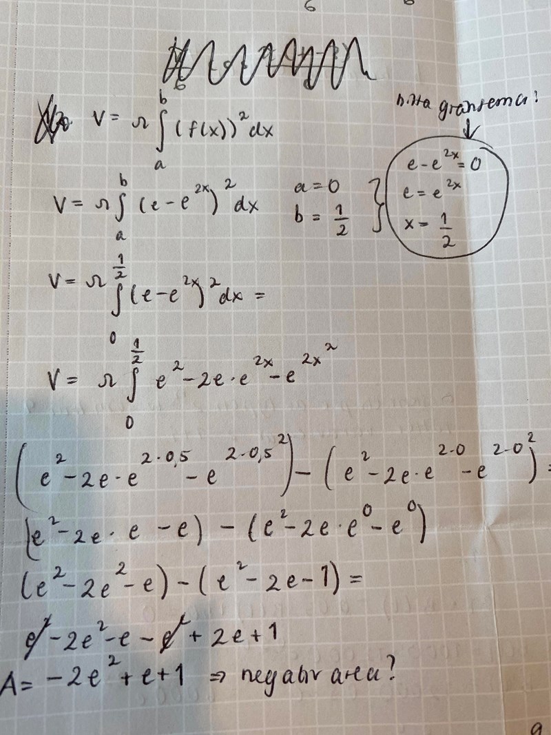”Ett område begränsas av kurvan y = e-e^2x och de positiva koordinataxlarna. När området roterar kring x-axeln uppstår en rotationskropp. Teckna ett uttryck för rotationskroppens volym och bestäm dess värde med minst tre värdesiffror”.